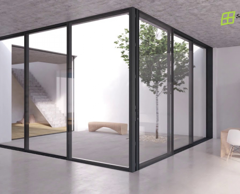 The rollers are placed in the frame, and the sashes feature a stainless-steel reinforced rolling area for smoother sliding movement. Furthermore, it offers the possibility of corner sash encounters at 90º without the need for a mullion.